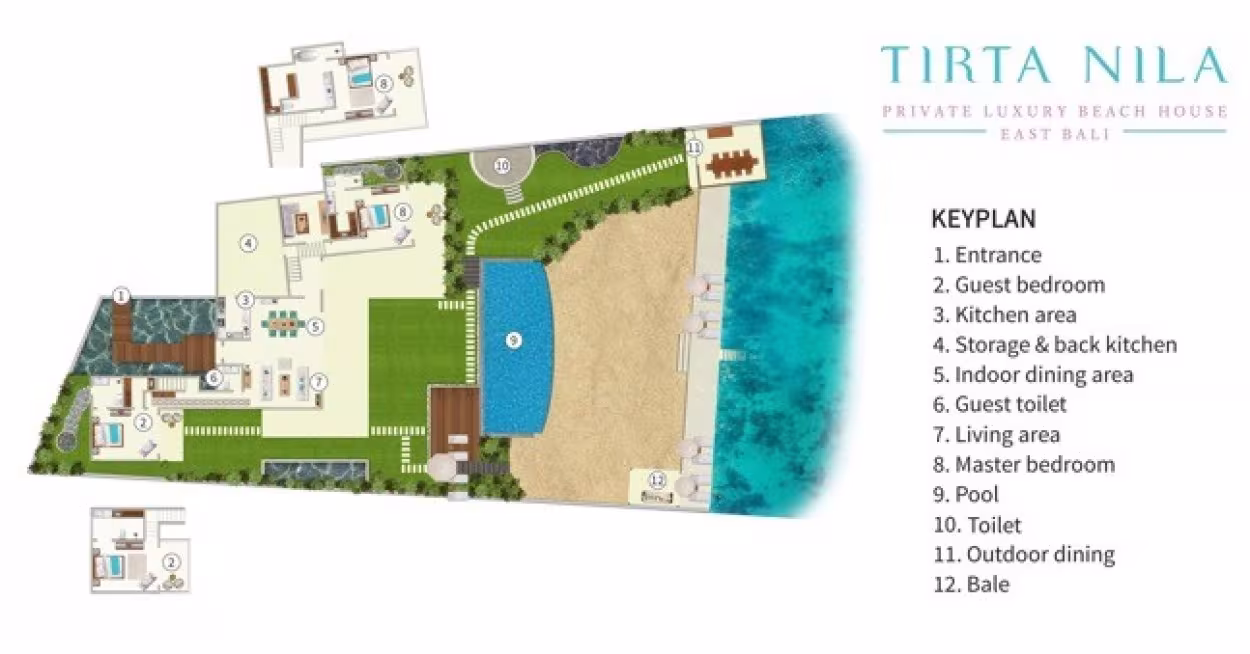 La sala de estar conduce directamente a la piscina infinita de 15 metros con terraza de madera y cuatro tumbonas. La piscina está ubicada directamente sobre una playa artificial privada, con acceso directo al mar. En cada extremo de la playa hay dos bales, uno elevado sobre el agua para cenar y entretenerse al aire libre, y el otro ubicado al nivel de la playa es un pabellón de relajación bale bengong.