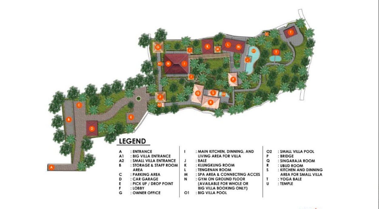 Une cuisine ouverte et entièrement équipée est à la disposition du personnel, qui pourra préparer vos repas à la demande – ou bien, si vous préférez, vous pourrez cuisiner vous-même. Dans la maison principale, vous trouverez également une salle multimédia / bibliothèque climatisée, équipée des meilleurs systèmes audio et vidéo. Les 4 chambres spacieuses et climatisées sont réparties dans des pavillons indépendants, dont deux partagent une cuisine ouverte et un pavillon de salle à manger privé, ainsi qu'une piscine privée alimentée par une source naturelle et une terrasse en bois. Chaque pavillon dispose d'une véranda meublée et d’une salle de bain avec cabine de douche, ainsi que d’un petit jardin clos avec une douche extérieure. Toutes les chambres sont équipées de la télévision par câble et d’un lecteur DVD, et les lits sont habillés de linge en coton de la meilleure qualité. Les quatre pavillons sont décorés différemment et portent le nom de quatre lieux emblématiques de Bali : Tenganan, Klung Kung, Ubud et Singaraja.