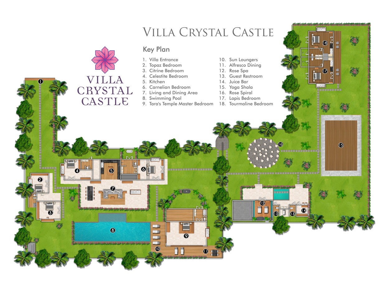 La Villa Crystal Castle comprend une chambre principale séparée de style palatial ainsi que 4 grandes chambres, toutes avec salle de bain attenante, en plus de deux chambres supplémentaires partageant une salle de bain dans un pavillon séparé. Idéale pour les retraites, six des chambres doubles peuvent être converties en configuration lits jumeaux. Parmi ses autres caractéristiques spéciales, la villa comprend une grande piscine de 18 x 5 mètres, un vaste Yoga Shala, un Pavillon de Soins Spa, ainsi qu’une spirale de réflexologie en quartz rose et galets, le tout au sein d’un jardin tropical de 4600 m². Très prisée pour les retraites de yoga et de bien-être, la Villa Crystal Castle met également à disposition de ses invités 17 tapis et coussins de yoga.